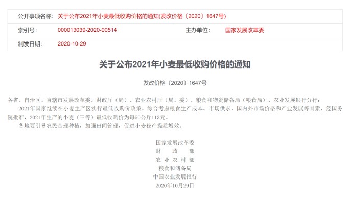 關(guān)于2021年小麥最低收購(gòu)價(jià)有關(guān)政策的通知各省、自治區(qū)、直轄市發(fā)展改革委、糧食和物資儲(chǔ)備局(糧食局)、財(cái)政廳(局)、農(nóng)業(yè)農(nóng)村廳(局、委)、農(nóng)業(yè)發(fā)展銀行分行,中國(guó)儲(chǔ)備糧管理集團(tuán)有限公司、中糧集團(tuán)有限公司、中國(guó)供銷集團(tuán)有限公司、中國(guó)中化集團(tuán)有限公司:為保障國(guó)家糧食安全,進(jìn)一步完善糧食最低收購(gòu)價(jià)政策,2021年繼續(xù)對(duì)最低收購(gòu)價(jià)小麥限定收購(gòu)總量。現(xiàn)將具體事項(xiàng)通知如下。根據(jù)近幾年小麥最低收購(gòu)價(jià)收購(gòu)數(shù)量,限定2021年最低收購(gòu)價(jià)小麥?zhǔn)召?gòu)總量為3700萬噸。(一)分批下達(dá)。限定收購(gòu)總量分兩批次下達(dá),第一批數(shù)量為3330萬噸,不分配到??;第二批數(shù)量為370萬噸,視收購(gòu)需要具體分配到省。當(dāng)最低收購(gòu)價(jià)全國(guó)收購(gòu)總量達(dá)到第一批數(shù)量的90%時(shí),中儲(chǔ)糧有關(guān)分公司應(yīng)會(huì)同省級(jí)糧食等部門單位及時(shí)提出本省第二批收購(gòu)的計(jì)劃數(shù)量建議。中儲(chǔ)糧集團(tuán)公司根據(jù)當(dāng)年小麥產(chǎn)量、收購(gòu)量、農(nóng)戶余糧和市場(chǎng)價(jià)格等情況統(tǒng)籌平衡各省數(shù)量后,報(bào)國(guó)家糧食和物資儲(chǔ)備局批準(zhǔn)。國(guó)家糧食和物資儲(chǔ)備局通過政府網(wǎng)站公布各省第二批收購(gòu)數(shù)量。在第一批收購(gòu)?fù)瓿珊?,有關(guān)省份按照批準(zhǔn)的第二批數(shù)量繼續(xù)開展收購(gòu)。當(dāng)收購(gòu)量達(dá)到本省批準(zhǔn)數(shù)量時(shí),立即停止該省最低收購(gòu)價(jià)收購(gòu)且不再啟動(dòng)。(二)動(dòng)態(tài)監(jiān)測(cè)。啟動(dòng)最低收購(gòu)價(jià)執(zhí)行預(yù)案后,中儲(chǔ)糧集團(tuán)公司要嚴(yán)格按照預(yù)案有關(guān)規(guī)定,加強(qiáng)統(tǒng)計(jì)監(jiān)測(cè),每五日向國(guó)家糧食和物資儲(chǔ)備局報(bào)送收購(gòu)進(jìn)度;啟動(dòng)第二批收購(gòu)后,中儲(chǔ)糧集團(tuán)公司要按日?qǐng)?bào)送收購(gòu)進(jìn)度。國(guó)家糧食和物資儲(chǔ)備局定期通過政府網(wǎng)站公布最低收購(gòu)價(jià)全國(guó)收購(gòu)總量。省級(jí)糧食等有關(guān)部門要結(jié)合小麥商品量和農(nóng)戶余糧情況,及時(shí)開展調(diào)研調(diào)度,全面掌握收糧進(jìn)度。(一)認(rèn)真落實(shí)限量收購(gòu)政策。中儲(chǔ)糧集團(tuán)公司作為最低收購(gòu)價(jià)政策執(zhí)行主體,要嚴(yán)格執(zhí)行限定收購(gòu)總量的收購(gòu)政策,不得超量收購(gòu)。財(cái)政資金支持限于最低收購(gòu)價(jià)政策下的最高收購(gòu)總量?jī)?nèi)。(二)加強(qiáng)市場(chǎng)監(jiān)管。各地要認(rèn)真落實(shí)糧食收儲(chǔ)制度改革精神,規(guī)范糧食流通市場(chǎng)秩序,依法依規(guī)嚴(yán)厲查處糧食收儲(chǔ)過程中的違法違規(guī)行為。(三)促進(jìn)“優(yōu)糧優(yōu)價(jià)”。各地要積極鼓勵(lì)農(nóng)企對(duì)接,充分發(fā)揮市場(chǎng)價(jià)格對(duì)生產(chǎn)的反饋引導(dǎo)作用,促進(jìn)種植結(jié)構(gòu)調(diào)整優(yōu)化,增加綠色優(yōu)質(zhì)安全產(chǎn)品供給。