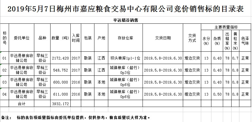 受客戶委托,梅州市嘉應(yīng)糧食交易中心有限公司定于2019年5月7日(星期二)舉辦糧食競價交易會,平遠(yuǎn)縣糧食收儲公司擬銷售2016年早秈稻1211噸,2017年早秈稻2721.172噸。