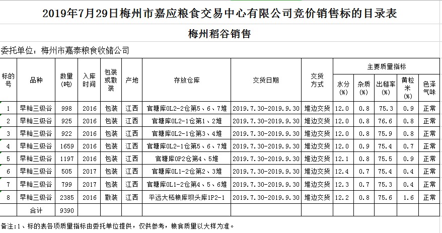 2019年7月29日梅州市嘉泰糧食收儲公司稻谷銷售