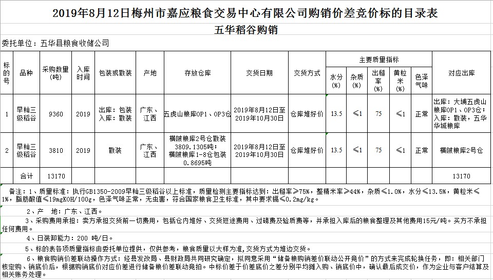 受客戶委托,梅州市嘉應(yīng)糧食交易中心有限公司定于2019年8月12日(星期一)舉辦稻谷購銷價差聯(lián)動標(biāo)的交易會,廣東省五華縣糧食收儲公司擬銷售和采購早秈稻13170噸。