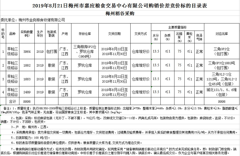 受客戶委托,梅州市嘉應(yīng)糧食交易中心有限公司定于2019年8月21日(星期三)舉辦稻谷購(gòu)銷(xiāo)價(jià)差聯(lián)動(dòng)標(biāo)的交易會(huì),梅州市金良糧食收儲(chǔ)有限公司擬銷(xiāo)售和采購(gòu)早秈稻9998噸。