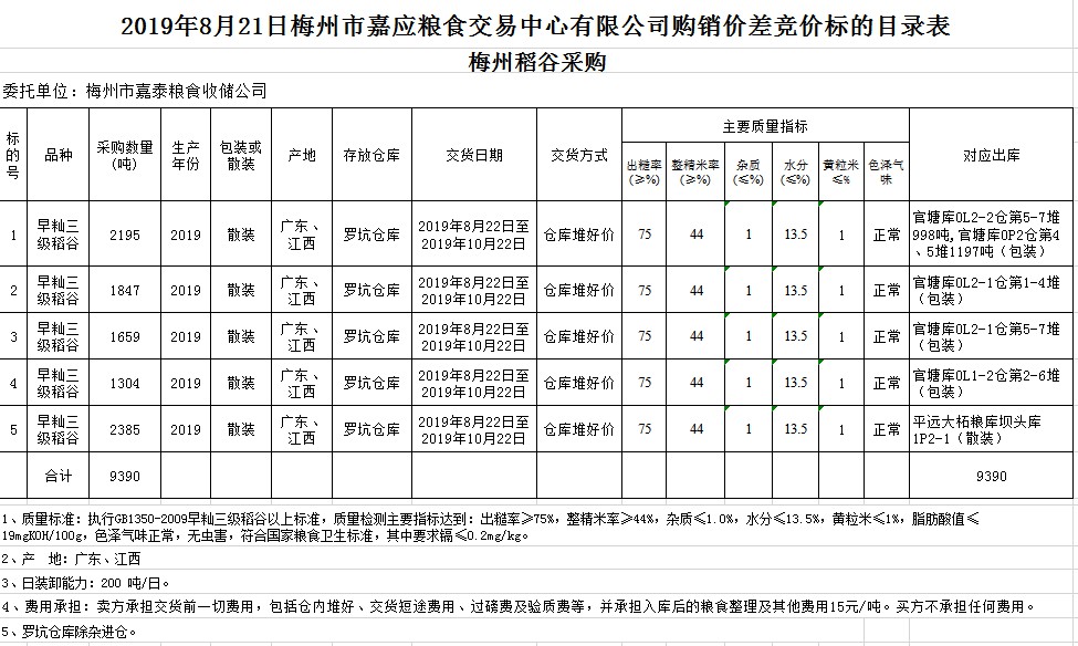 受客戶委托,梅州市嘉應糧食交易中心有限公司定于2019年8月21日(星期三)舉辦稻谷購銷價差聯(lián)動標的交易會,梅州市嘉泰糧食收儲公司擬銷售和采購早秈稻9390噸。