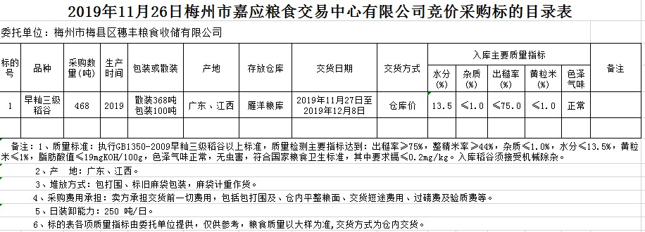 交易時(shí)間和地點(diǎn):2019年11月26日(星期二)上午10時(shí)。廣東省梅州市彬芳大道南161號(hào)梅州市糧食交易中心3樓。