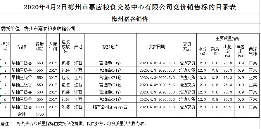 受客戶委托,梅州市嘉應(yīng)糧食交易中心有限公司定于2020年4月2日(星期四)舉辦糧食競價交易會,梅州市嘉泰糧食收儲公司擬銷售2017年早秈稻4700噸。