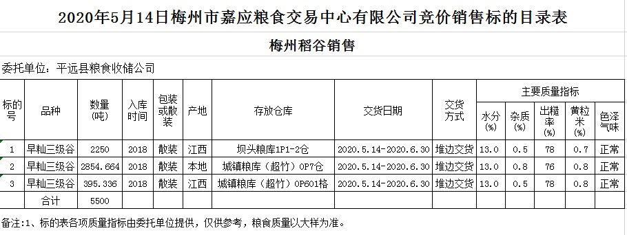 受客戶委托,梅州市嘉應(yīng)糧食交易中心有限公司定于2020年5月14日(星期四)舉辦糧食競價交易會,平遠(yuǎn)縣糧食收儲公司擬銷售2018年早秈稻5500噸。