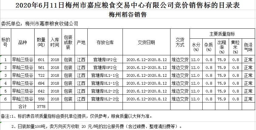 受客戶委托,梅州市嘉應(yīng)糧食交易中心有限公司定于2020年6月11日(星期四)舉辦糧食競價(jià)交易會,梅州市嘉泰糧食收儲公司擬銷售2018年早秈稻3778噸。