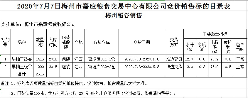 受客戶委托,梅州市嘉應(yīng)糧食交易中心有限公司定于2020年7月7日(星期二)舉辦糧食競價交易會,梅州市嘉泰糧食收儲公司擬銷售2018年早秈稻2616噸。