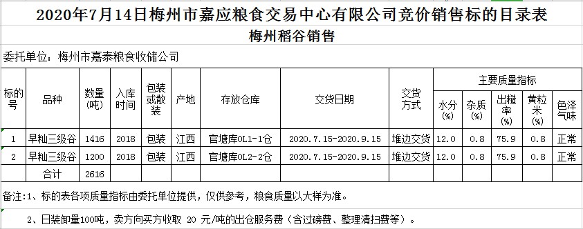 受客戶委托,梅州市嘉應(yīng)糧食交易中心有限公司定于2020年7月14日(星期二)舉辦糧食競價交易會,梅州市嘉泰糧食收儲公司擬銷售2018年早秈稻2616噸。