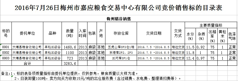 受客戶委托,梅州市嘉應(yīng)糧食交易中心有限公司定于2016年7月26日舉辦糧食競(jìng)價(jià)交易會(huì),大埔縣糧食收儲(chǔ)公司擬銷售2013年早秈稻谷3283.6噸。