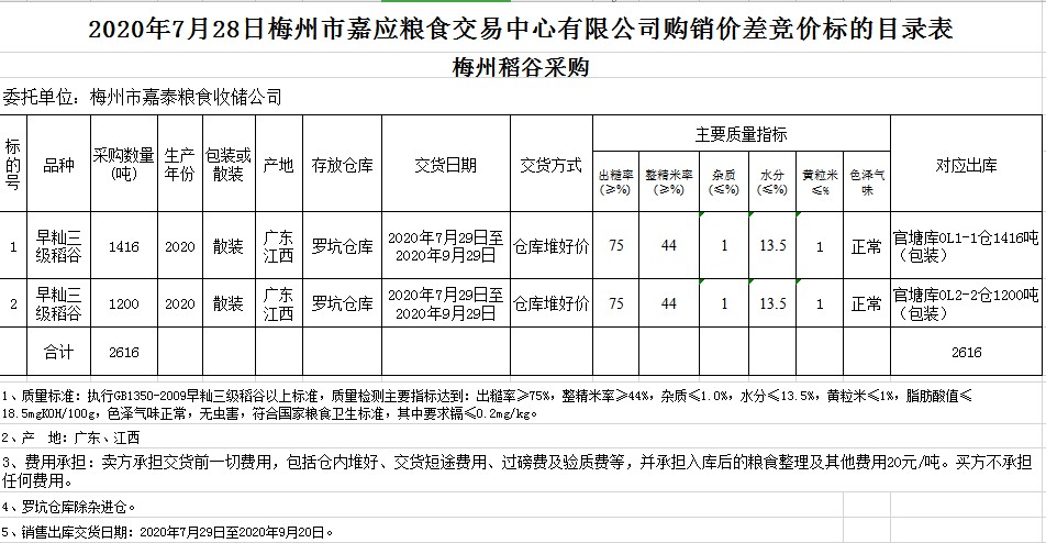 受客戶委托,梅州市嘉應(yīng)糧食交易中心有限公司定于2020年7月28日(星期二)舉辦稻谷購銷價差聯(lián)動標的交易會,梅州市嘉泰糧食收儲公司擬銷售和采購早秈稻2616噸。
