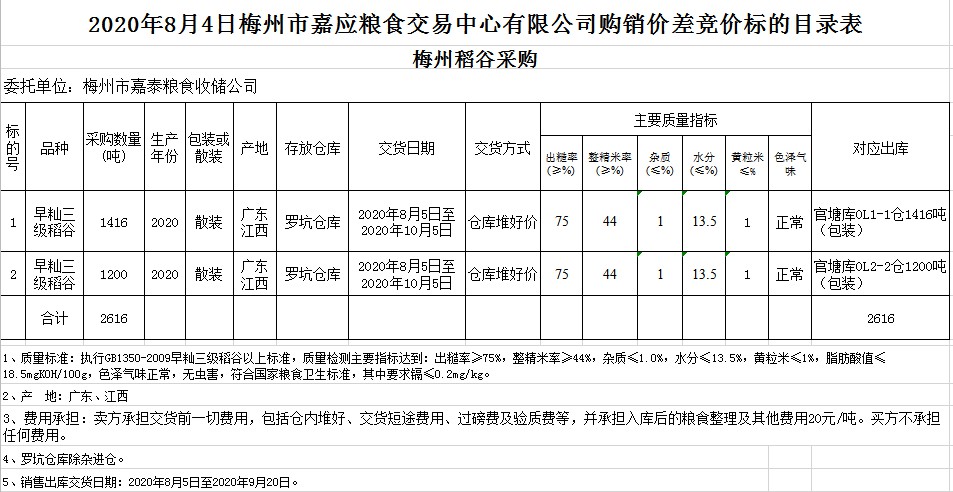 受客戶委托,梅州市嘉應(yīng)糧食交易中心有限公司定于2020年8月4日(星期二)舉辦稻谷購(gòu)銷價(jià)差聯(lián)動(dòng)標(biāo)的交易會(huì),梅州市嘉泰糧食收儲(chǔ)公司擬銷售和采購(gòu)早秈稻2616噸。