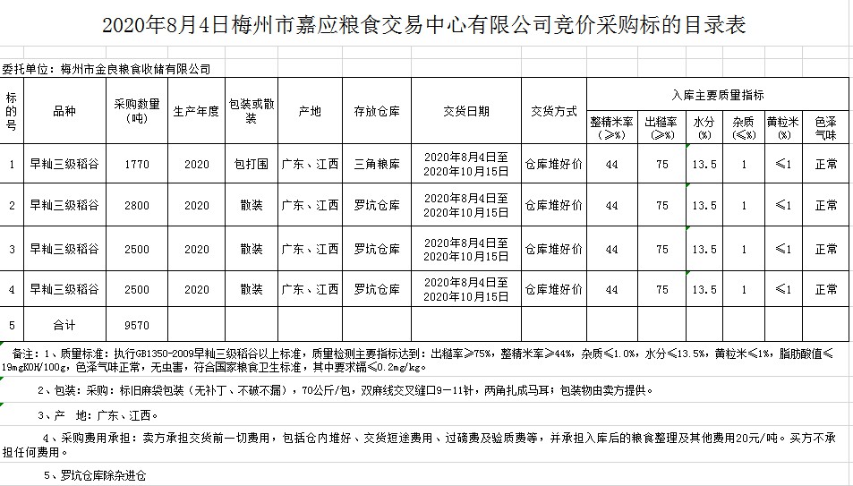 受客戶委托,梅州市嘉應(yīng)糧食交易中心有限公司定于2020年8月4日(星期二)舉辦糧食競(jìng)價(jià)交易會(huì),梅州市金良糧食收儲(chǔ)有限公司擬采購(gòu)2020年早秈稻9570噸。