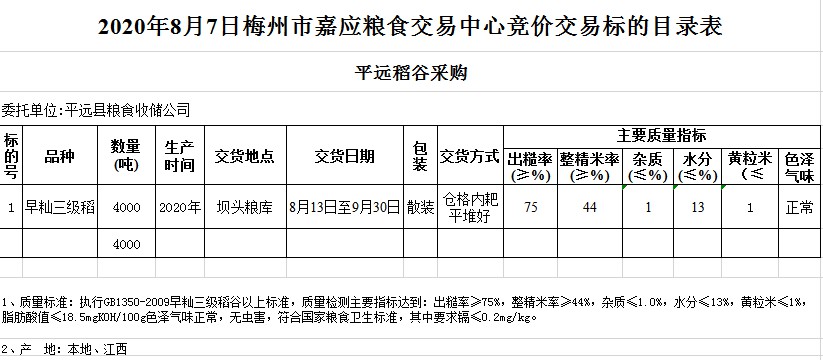 交易時(shí)間和地點(diǎn):2020年8月7日(星期五)上午10時(shí)。廣東省梅州市彬芳大道南161號梅州市糧食交易中心3樓。