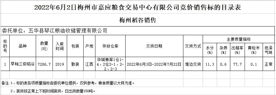 受客戶委托,梅州市嘉應(yīng)糧食交易中心有限公司定于2022年6月2日(星期四)舉辦糧食競價交易會。五華縣琴江糧油收儲管理有限公司擬銷售2019年早秈稻7286.7噸。