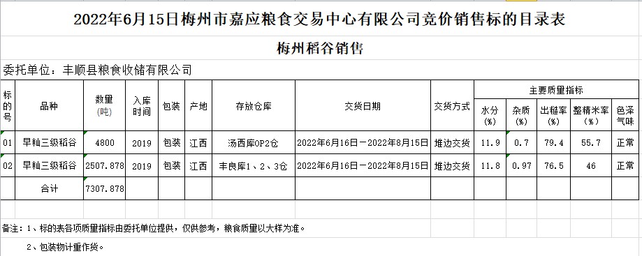 受客戶(hù)委托,梅州市嘉應(yīng)糧食交易中心有限公司定于2022年6月15日(星期三)舉辦糧食競(jìng)價(jià)交易會(huì)。豐順縣糧食收儲(chǔ)有限公司擬銷(xiāo)售2019年早秈稻7307.878噸。