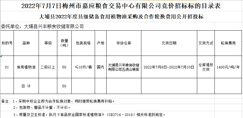 2022年7月7日大埔縣興豐糧食收儲有限公司食用植物油采購及合作輪換費公開競價招標(biāo)公告