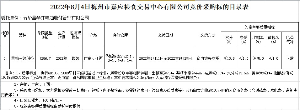 受客戶委托,梅州市嘉應(yīng)糧食交易中心有限公司定于2022年8月4日(星期四)舉辦糧食競價(jià)交易會。五華縣琴江糧油收儲管理有限公司擬采購2022年早秈稻7286.7噸。