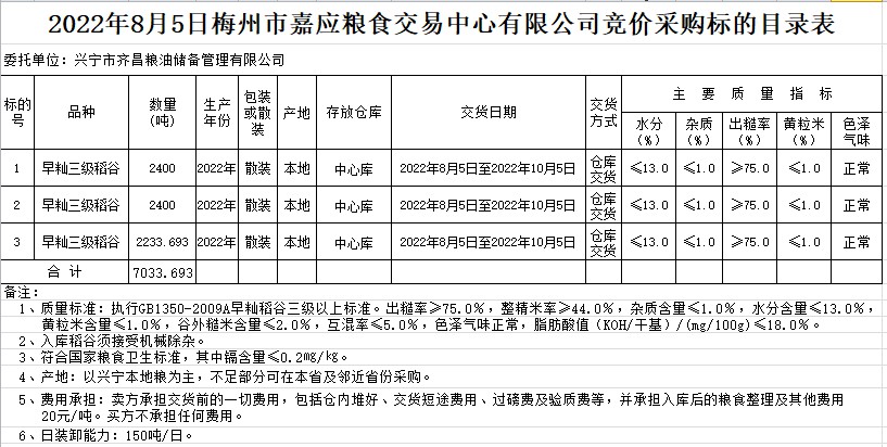 受客戶委托,梅州市嘉應(yīng)糧食交易中心有限公司定于2022年8月5日(星期五)舉辦糧食競價交易會。興寧市齊昌糧油儲備管理有限公司擬采購2022年早秈稻7033.693噸。