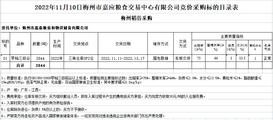 受客戶(hù)委托,梅州市嘉應(yīng)糧食交易中心有限公司定于2022年11月10日(星期四)舉辦糧食競(jìng)價(jià)交易會(huì)。梅州市嘉泰糧食和物資儲(chǔ)備有限公司擬采購(gòu)2022年早秈稻2844噸。