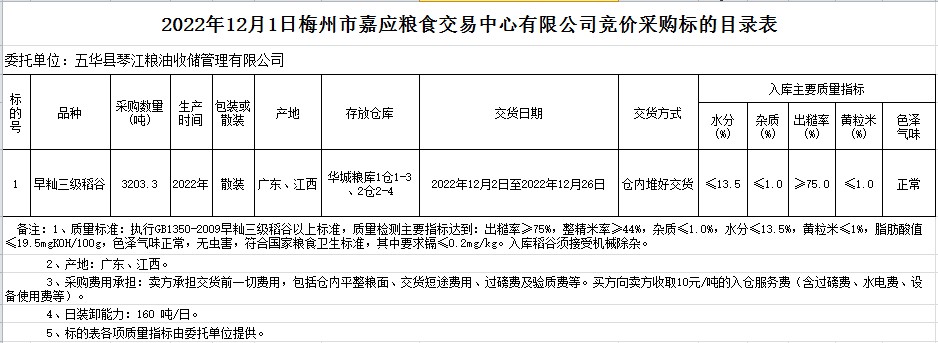 受客戶委托,梅州市嘉應(yīng)糧食交易中心有限公司定于2022年12月1日(星期四)舉辦糧食競(jìng)價(jià)交易會(huì)。五華縣琴江糧油收儲(chǔ)管理有限公司擬采購(gòu)2022年早秈稻3203.3噸。