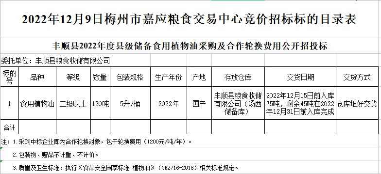 豐順縣2022年度縣級(jí)儲(chǔ)備食用植物油采購(gòu)及合作輪換費(fèi)用公開(kāi)招投標(biāo)公告