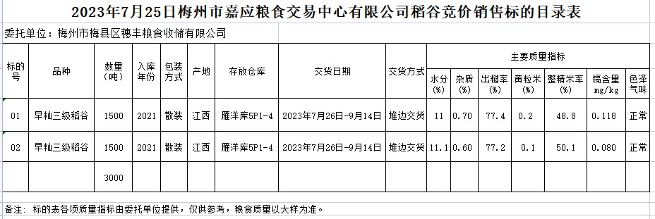 受客戶委托,梅州市嘉應(yīng)糧食交易中心有限公司定于2023年7月25日(星期二)舉辦糧食競價交易會。梅州市梅縣區(qū)穗豐糧食收儲有限公司擬銷售2021年早秈稻3000噸。