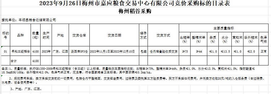 受客戶委托,梅州市嘉應(yīng)糧食交易中心有限公司定于2023年9月26日(星期二)舉辦糧食競價(jià)交易會(huì)。豐順縣糧食收儲(chǔ)有限公司擬采購2023年早秈稻谷4100噸。