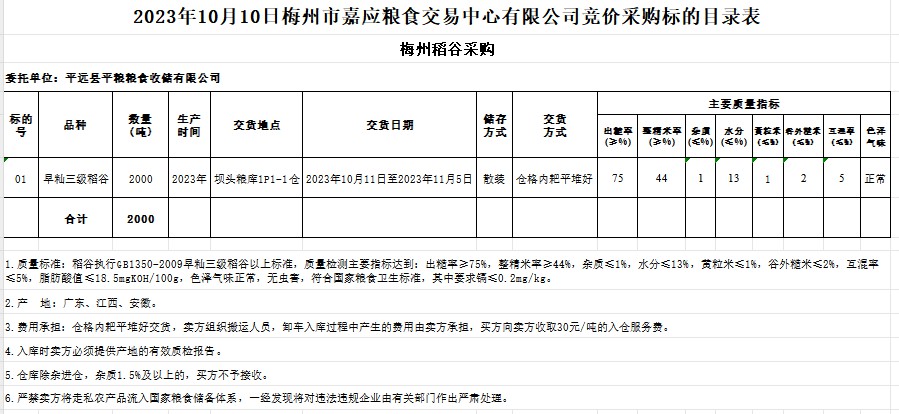 2023年10月10日平遠(yuǎn)縣平糧糧食收儲有限公司稻谷采購
