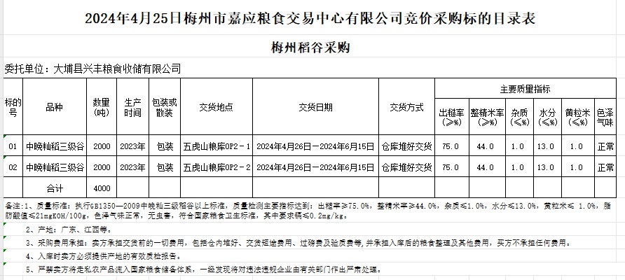 2024年4月25日大埔縣興豐糧食收儲(chǔ)有限公司稻谷采購(gòu)