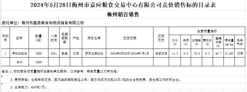 受客戶委托,梅州市嘉應(yīng)糧食交易中心有限公司定于2024年5月28日(星期二)舉辦糧食競(jìng)價(jià)交易會(huì)。梅州市嘉泰糧食和物資儲(chǔ)備有限公司擬銷(xiāo)售2021年產(chǎn)早秈稻2000噸。