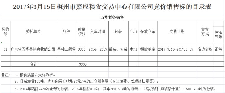 受客戶委托,梅州市嘉應糧食交易中心有限公司定于2017年3月15日舉辦糧食競價交易會,廣東省五華縣糧食收儲公司擬銷售早秈三級稻谷3300噸。