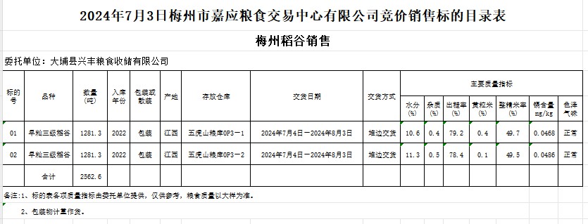 受客戶委托,梅州市嘉應(yīng)糧食交易中心有限公司定于2024年7月3日(星期三)舉辦糧食競(jìng)價(jià)交易會(huì)。大埔縣興豐糧食收儲(chǔ)有限公司擬銷售2022年產(chǎn)早秈稻谷2562.6噸。