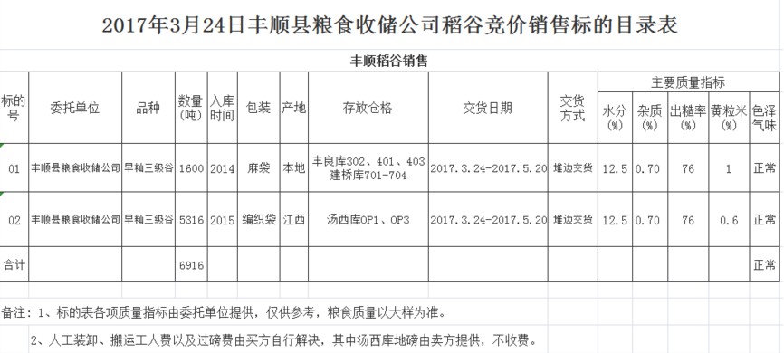 受客戶委托,梅州市嘉應(yīng)糧食交易中心有限公司定于2017年3月24日舉辦糧食競(jìng)價(jià)交易會(huì),豐順縣糧食收儲(chǔ)公司擬銷售早秈三級(jí)稻谷6916噸。