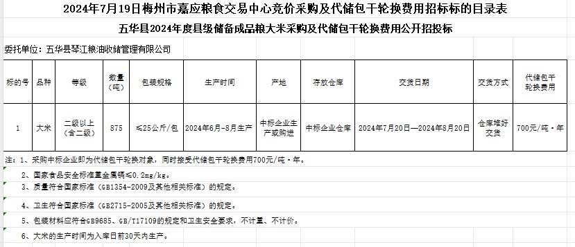 五華縣2024年度縣級儲備成品糧大米采購及代儲包干輪換費用公開招標(biāo)公告