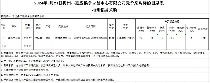 受客戶委托,梅州市嘉應(yīng)糧食交易中心有限公司定于2024年8月21日(星期三)舉辦糧食競價(jià)交易會(huì)。平遠(yuǎn)縣平糧糧食收儲(chǔ)有限公司擬采購2024年產(chǎn)早秈稻870.57噸。