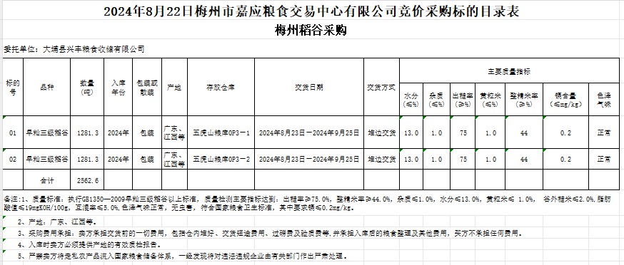 受客戶委托,梅州市嘉應(yīng)糧食交易中心有限公司定于2024年8月22日(星期四)舉辦糧食競(jìng)價(jià)交易會(huì)。大埔縣興豐糧食收儲(chǔ)有限公司擬采購(gòu)2024年產(chǎn)早秈稻谷2562.6噸。