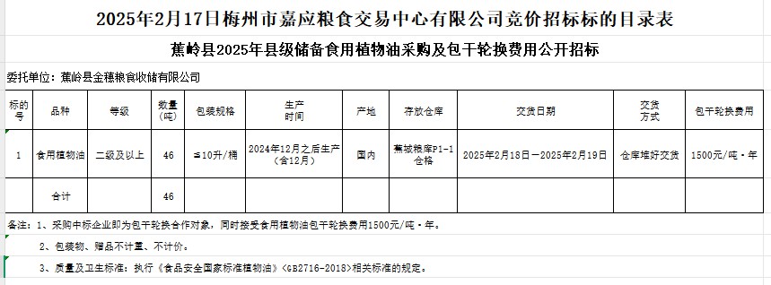 文件下載:2025年2月17日蕉嶺縣2025年縣級儲備食用植物油采購及包干輪換費(fèi)用公開招標(biāo)公告