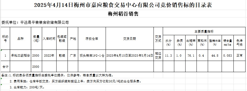 受客戶委托,梅州市嘉應糧食交易中心有限公司定于2025年4月14日(星期一)舉辦糧食競價交易會。平遠縣平糧糧食收儲有限公司擬銷售2022年產早秈稻谷2000噸。