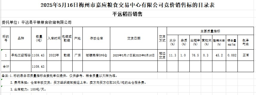 受客戶委托,梅州市嘉應(yīng)糧食交易中心有限公司定于2025年5月16日(星期五)舉辦糧食競(jìng)價(jià)交易會(huì)。平遠(yuǎn)縣平糧糧食收儲(chǔ)有限公司擬銷售2022年產(chǎn)早秈稻谷1109.43噸。