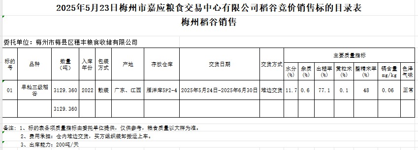 受客戶委托,梅州市嘉應(yīng)糧食交易中心有限公司定于2025年5月23日(星期五)舉辦糧食競(jìng)價(jià)交易會(huì)。梅州市梅縣區(qū)穗豐糧食收儲(chǔ)有限公司擬銷(xiāo)售2022年產(chǎn)早秈稻谷3129.360噸。