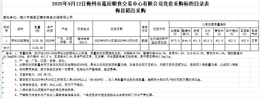 受客戶委托,梅州市嘉應糧食交易中心有限公司定于2025年9月12日(星期五)舉辦糧食競價交易會。梅州市梅縣區(qū)穗豐糧食收儲有限公司擬采購2025年產(chǎn)早秈稻谷3129.36噸。