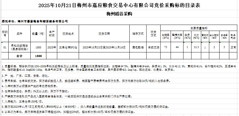 受客戶委托,梅州市嘉應(yīng)糧食交易中心有限公司定于2025年10月21日(星期二)舉辦糧食競(jìng)價(jià)交易會(huì)。梅州市嘉泰糧食和物資儲(chǔ)備有限公司擬采購2025年產(chǎn)早秈稻谷1800噸。