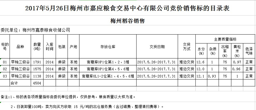 2017年5月26日梅州市嘉泰糧食收儲(chǔ)公司稻谷銷售