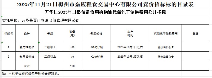 五華縣2025年縣級(jí)儲(chǔ)備食用植物油采購(gòu)及代儲(chǔ)包干輪換費(fèi)用公開招標(biāo)公告