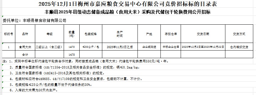 豐順縣2025年縣級(jí)動(dòng)態(tài)儲(chǔ)備成品糧(食用大米)采購(gòu)及代儲(chǔ)包干輪換費(fèi)用公開(kāi)招標(biāo)公告