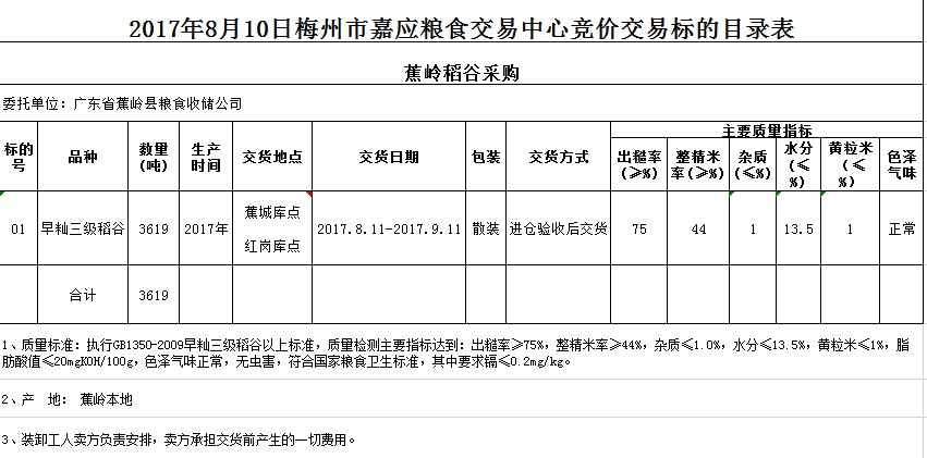 受客戶委托,梅州市嘉應(yīng)糧食交易中心有限公司定于2017年8月10日舉辦糧食競價交易會,廣東省蕉嶺縣糧食收儲公司擬采購2017年早秈三級稻谷共3619噸。