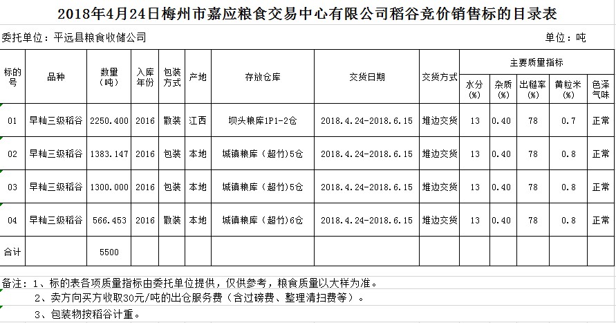 受客戶委托,梅州市嘉應(yīng)糧食交易中心有限公司定于2018年4月24日(星期二)舉辦糧食競(jìng)價(jià)交易會(huì),平遠(yuǎn)縣糧食收儲(chǔ)公司擬銷售早秈稻5500噸。