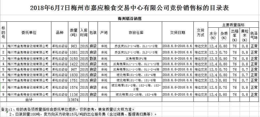 交易時間和地點:2018年6月7日(星期四)上午10時。廣東省梅州市彬芳大道南161號梅州市糧食交易中心3樓。