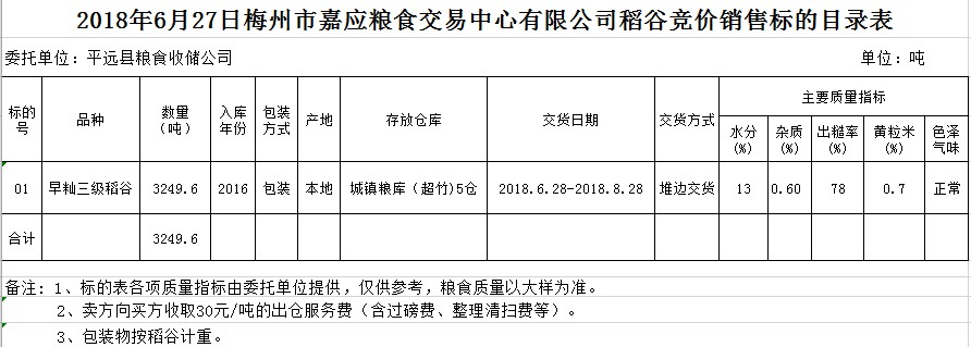 受客戶委托,梅州市嘉應(yīng)糧食交易中心有限公司定于2018年6月27日(星期三)舉辦糧食競價交易會,平遠縣糧食收儲公司擬銷售早秈稻3249.6噸。