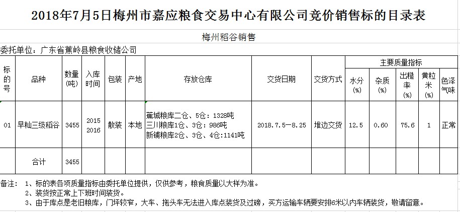 受客戶委托,梅州市嘉應(yīng)糧食交易中心有限公司定于2018年7月5日(星期四)舉辦糧食競價(jià)交易會(huì),廣東省蕉嶺縣糧食收儲(chǔ)公司擬銷售早秈稻3455噸。